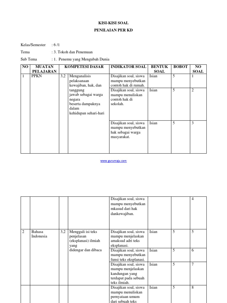 Kumpulan Soal Kelas 6 SD Lengkap dengan Kisi-Kisi Soal. Contoh kisi-kisi soal ipa sd kelas 6.