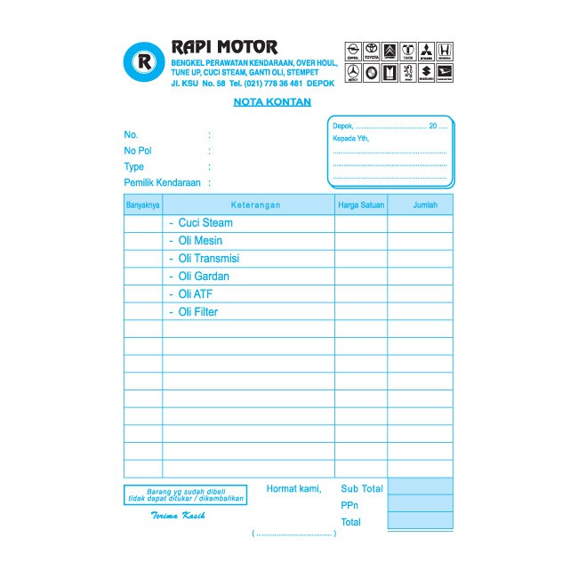 Contoh nota bon bengkel honda. Salah satu bisnis jasa yang sangat prospektif dan bisa memberikan keuntungan melimpah untuk Anda adalah jasa bengkel terutama jasa bengkel motor. Bengkel Motor di Puncak.